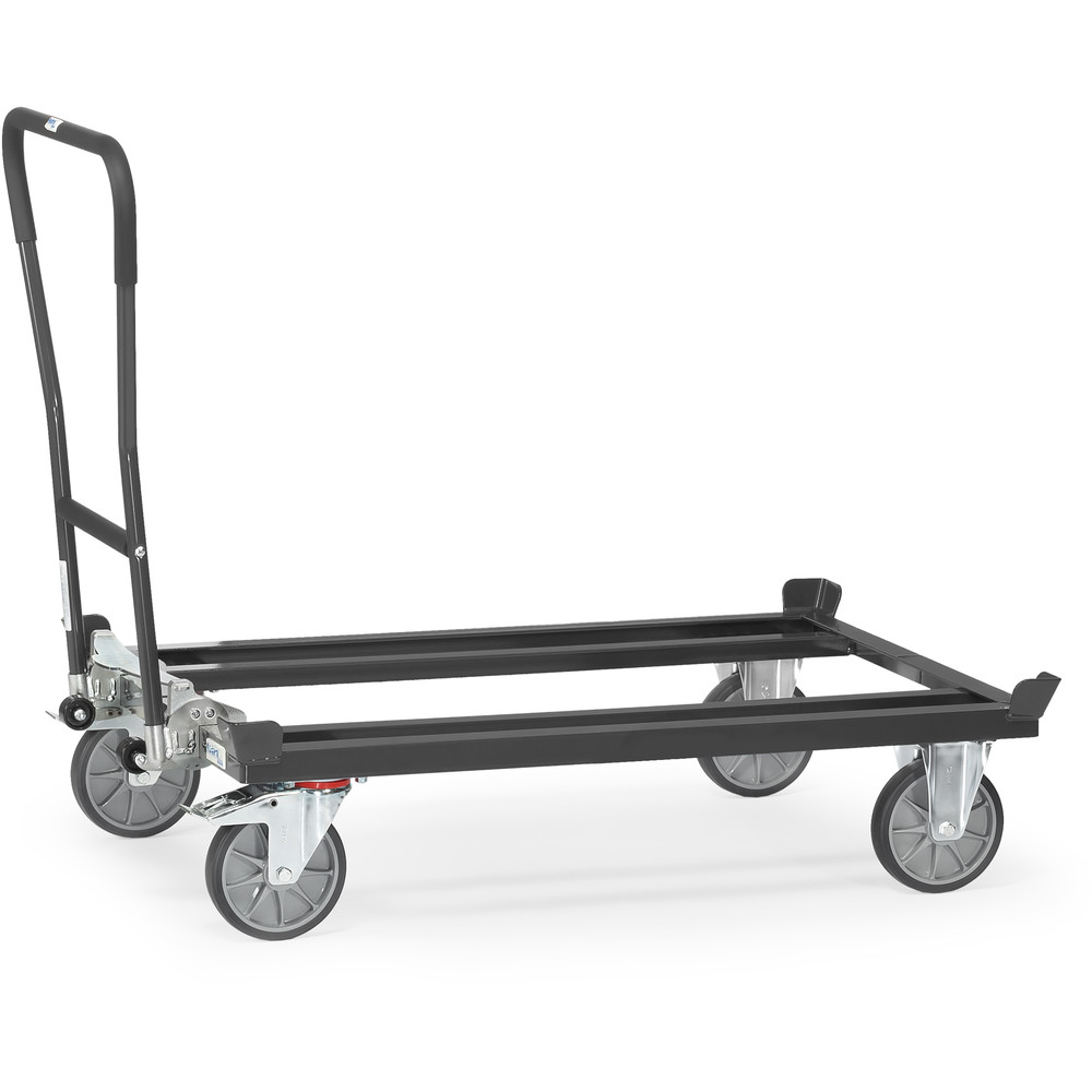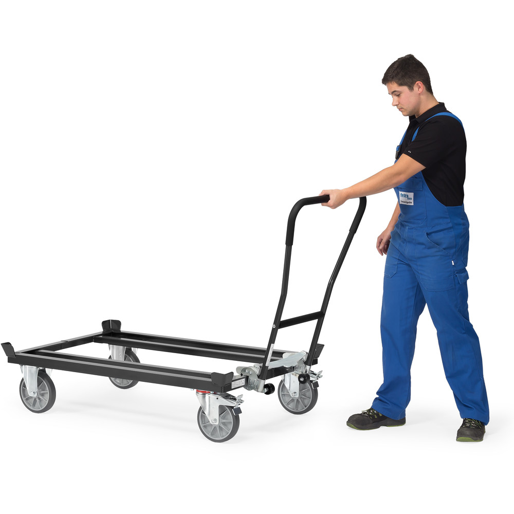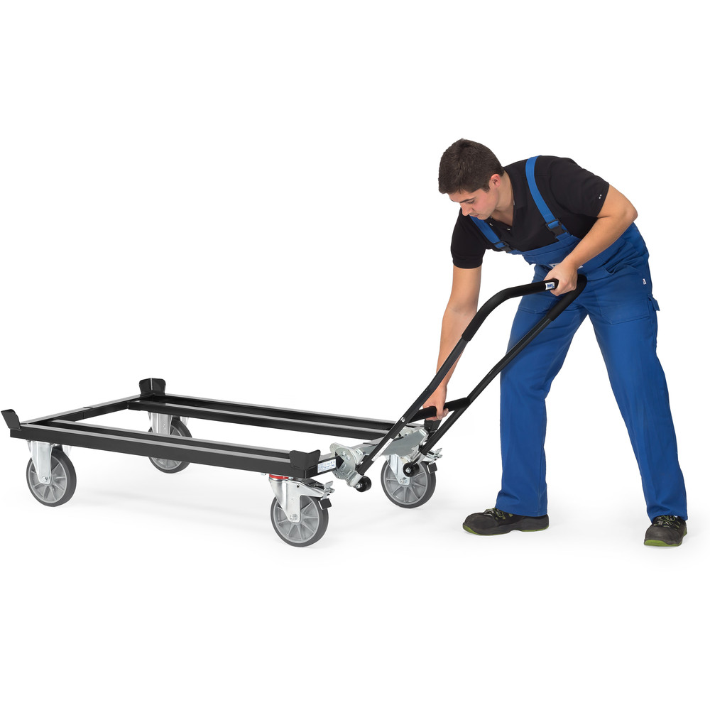 Der Einklink-Rohrschiebebügel kann als Schiebebügel für fetra Paletten-Fahrgestelle genutzt werden. Zum bequemen rückenschonenden Verfahren von leeren und beladenen Paletten-Fahrgestellen. Äußerst robuste Stahlrohr-Konstruktion mit kräftigen Verbindungsklauen. Bügel und Querbügel mit Softgrip-Bezug. Im ausgeklinkten Zustand mittels 2 Hilfsrollen kräfteschonend verfahrbar. Nicht für das leichte Paletten-Fahrgestell und die Paletten-Fahrgestelle mit Ladeflächenabmessung 810 x 610 mm geeignet.