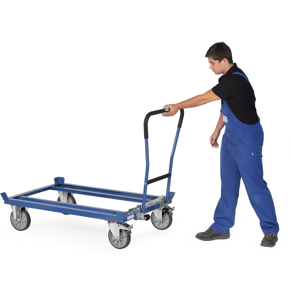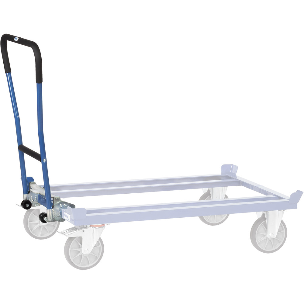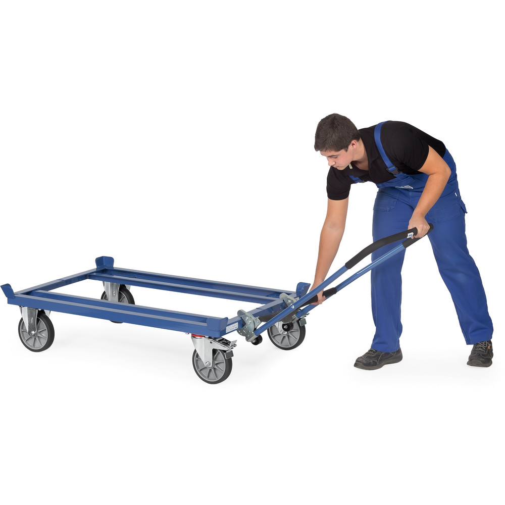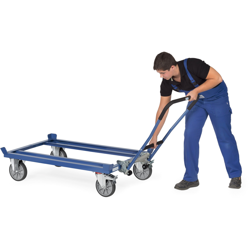 Einklinkbarer Schiebebügel für Paletten-Fahrgestelle. Zum bequemen rückenschonenden Verfahren von leeren und beladenen Paletten-Fahrgestellen. Äußerst robuste Stahlrohr-Konstruktion mit kräftigen Verbindungsklauen. Bügel und Querbügel mit Softgrip-Bezug. Im ausgeklinkten Zustand mittels 2 Hilfsrollen kräfteschonend verfahrbar. Gebrauchsmuster: 20 2014 010 367. Nicht für das leichte Paletten-Fahrgestell und die Paletten-Fahrgestelle mit Ladeflächenabmessung 810 x 610 mm geeignet.