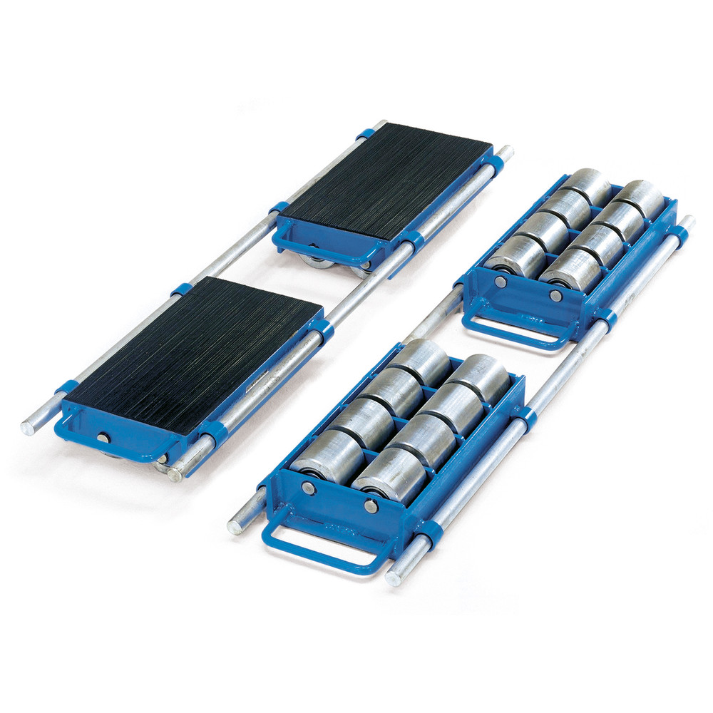 Fahrwerk für den leichten und sicheren Transport von Maschinen und anderen schweren Gegenständen. Stabile Stahl-Schweißkonstruktion, mit Handgriffen aus Rundstahl, pulverbeschichtet blau RAL 5007. Tragplatten mit rutschhemmender Gummiauflage versehen. Große Stahlrollen kugelgelagert. Lieferumfang: 2 Transportroller und 2 Verbindungsstangen aus Rundstahl.