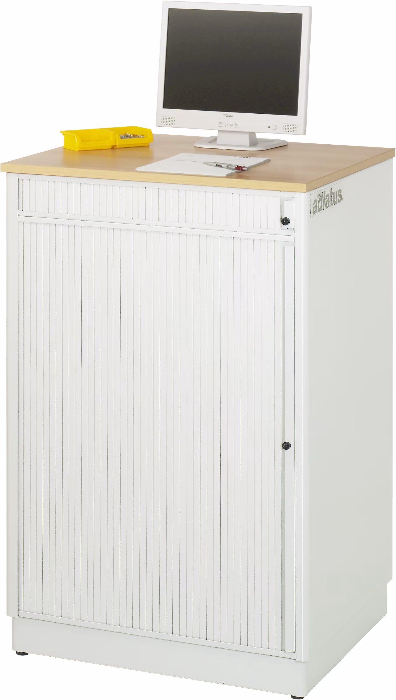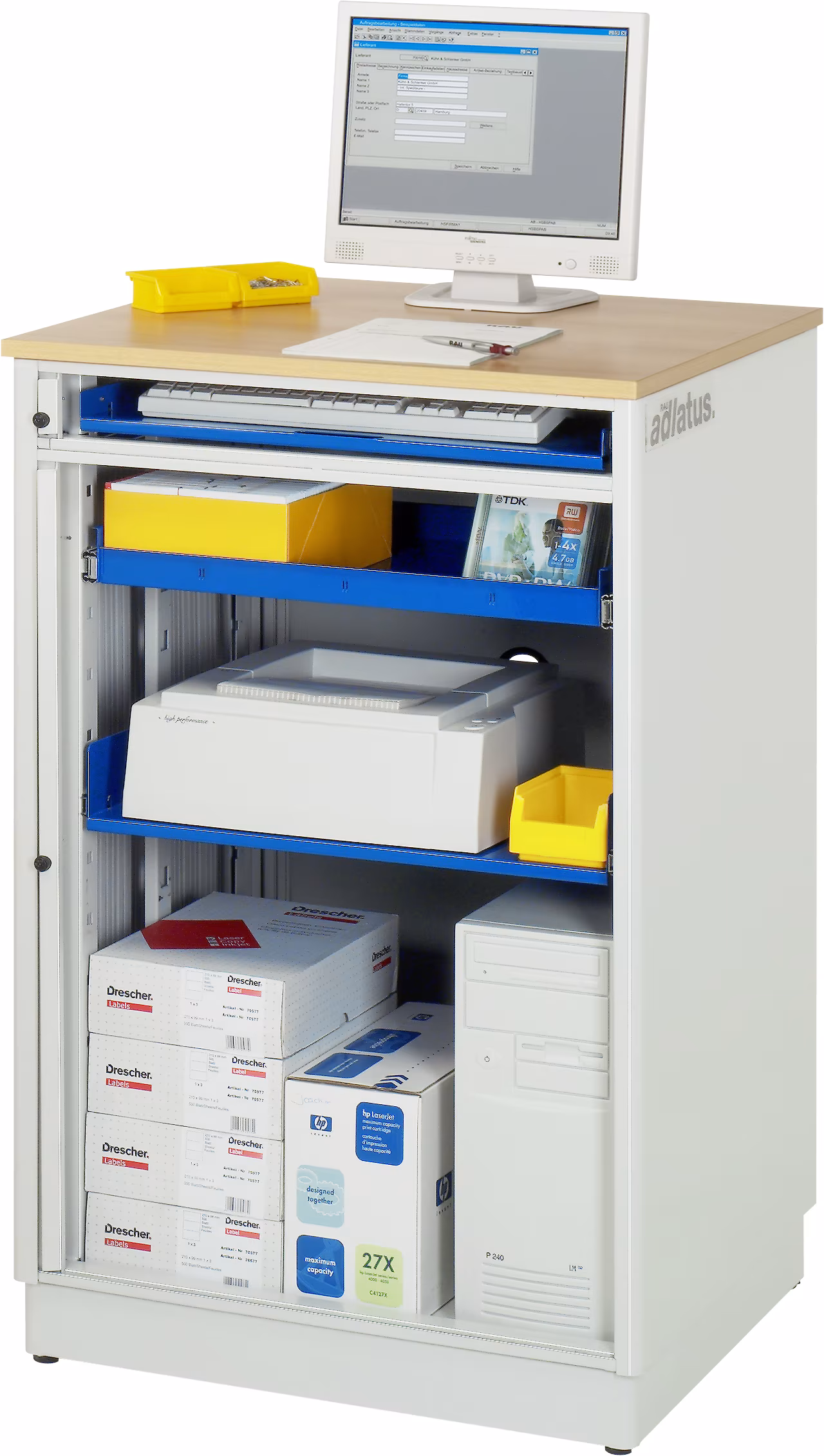 Piano di lavoro in faggio decorato (spessore 22 mm). Piano e parte inferiore con rivestimento diretto. Resistente agli spruzzi e allo sporco. Piano di lavoro con apertura per cavi.Armadietto di base suddiviso in scomparti per tastiera e ferramenta utilizzabili e azionabili separatamente. Entrambi i vani possono essere chiusi da una tapparella separata, guidata verticalmente (apertura a sinistra). Ingresso cavi sul retro dell'armadio e aperture per i cavi nella base e nella parte interna. Zoccolo del mobile (H 80 mm) con piedini regolabili. Vano tastiera (altezza 75 mm) con tapparella trasversale (bloccabile, apertura a sinistra) e cassetto per tastiera. Cassetto per tastiera L575 x P350 mm con supporto estraibile (MDF) destro o sinistro per tastiera e mouse (estrazione 100 %, portata 20 kg, punto di aggancio). Vano per la ferramenta (altezza 875 mm) con serranda a croce (bloccabile, apertura a sinistra) con la seguente suddivisione interna (altezza di montaggio regolabile): 1 x ciabatta con 4 prese, interruttore on/off e cavo di collegamento con spina (standard Germania). 1 ripiano estraibile L570 x P450 mm (estrazione 80%, portata 20 kg, punto di aggancio). 1 cassetto interno L570 x P450 mm (estrazione 100%, portata 35 kg). Verniciato a polvere Portata totale max. 200 kg Fornito completamente assemblato Garanzia di qualità 5 anni Made in Germany